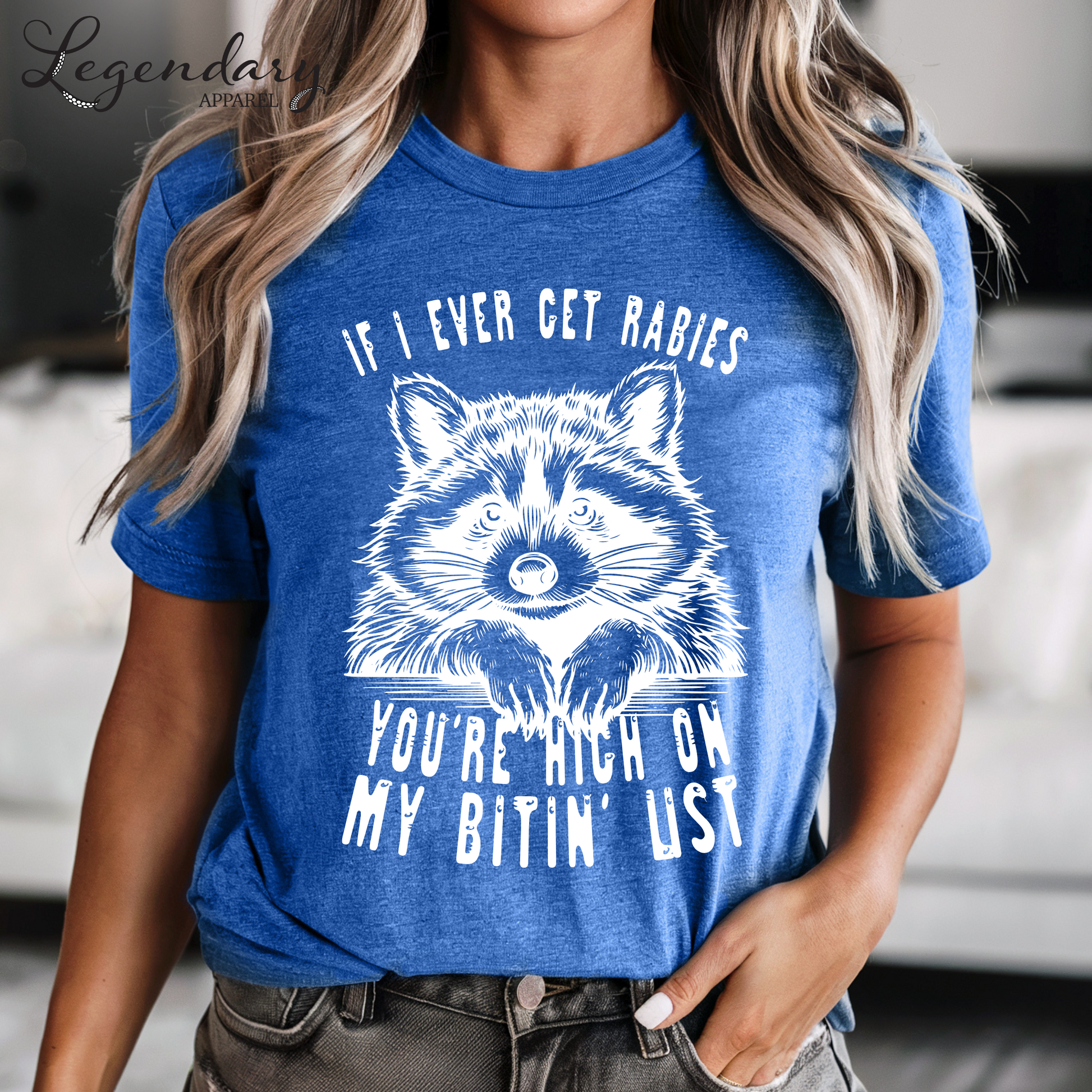 Add some bite to your wardrobe with this hilarious graphic tee! Featuring the bold phrase “If I Ever Get Rabies You’re High On My Bitin’ List”, this shirt is perfect for anyone who loves sarcastic humor, edgy jokes, and witty comebacks. Comfortable, soft, and durable, it’s a versatile everyday tee that pairs perfectly with jeans, shorts, or layered under a jacket.