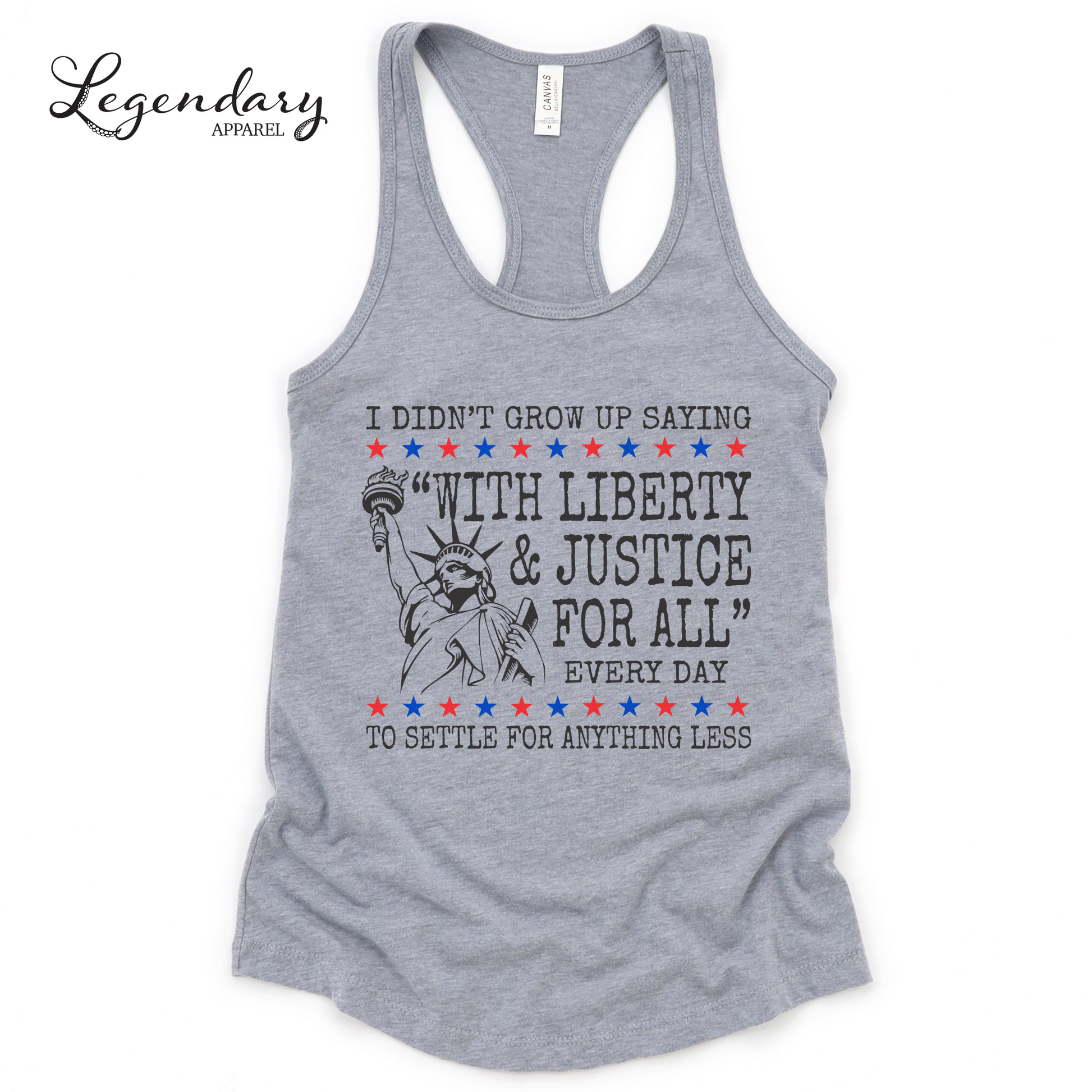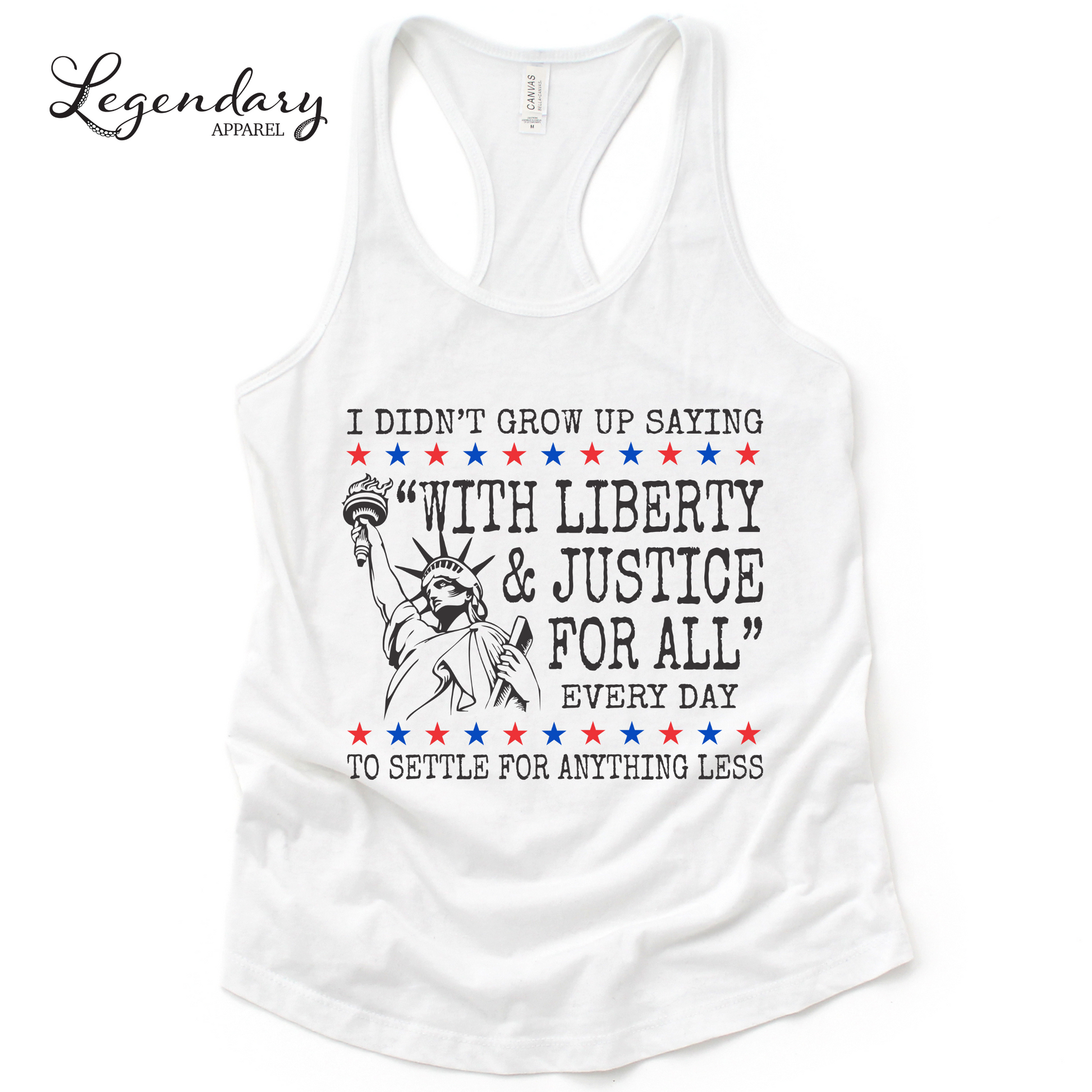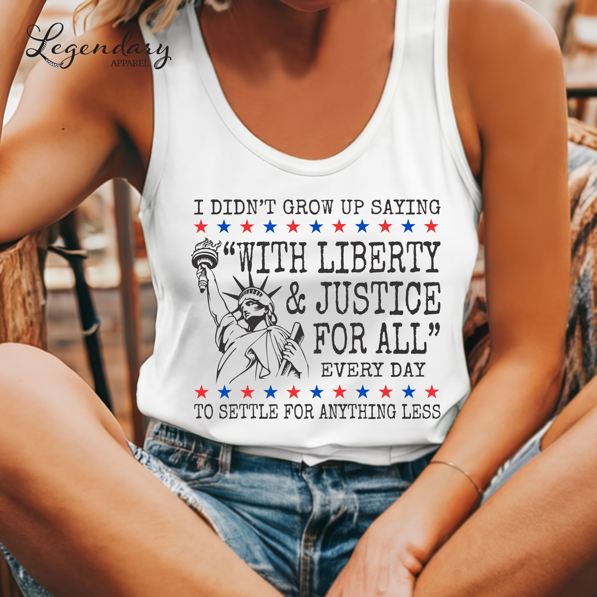Stand proud with our "I Didn't Grow Up Saying With Liberty and Justice for All to Settle for Anything Else" tank top — a bold reminder that freedom and equality are not negotiable. This powerful and patriotic shirt is perfect for activists, proud Americans, and anyone who stands for justice and true liberty. Made with premium materials for comfort and durability, it's a statement piece for rallies, protests, Fourth of July celebrations, or everyday wear. Wear your values. Demand better. Never settle!