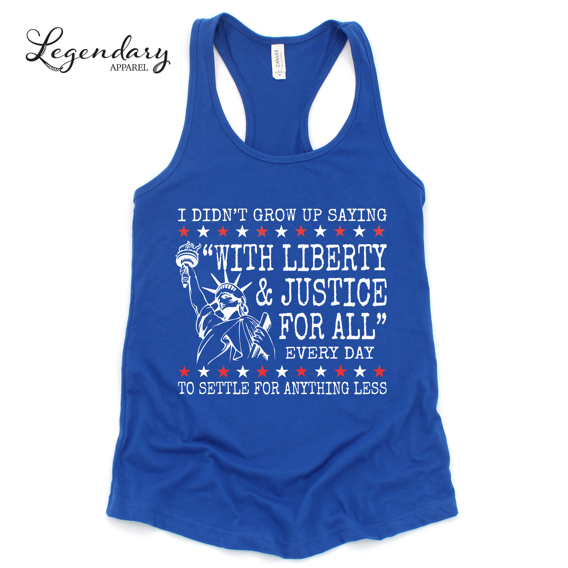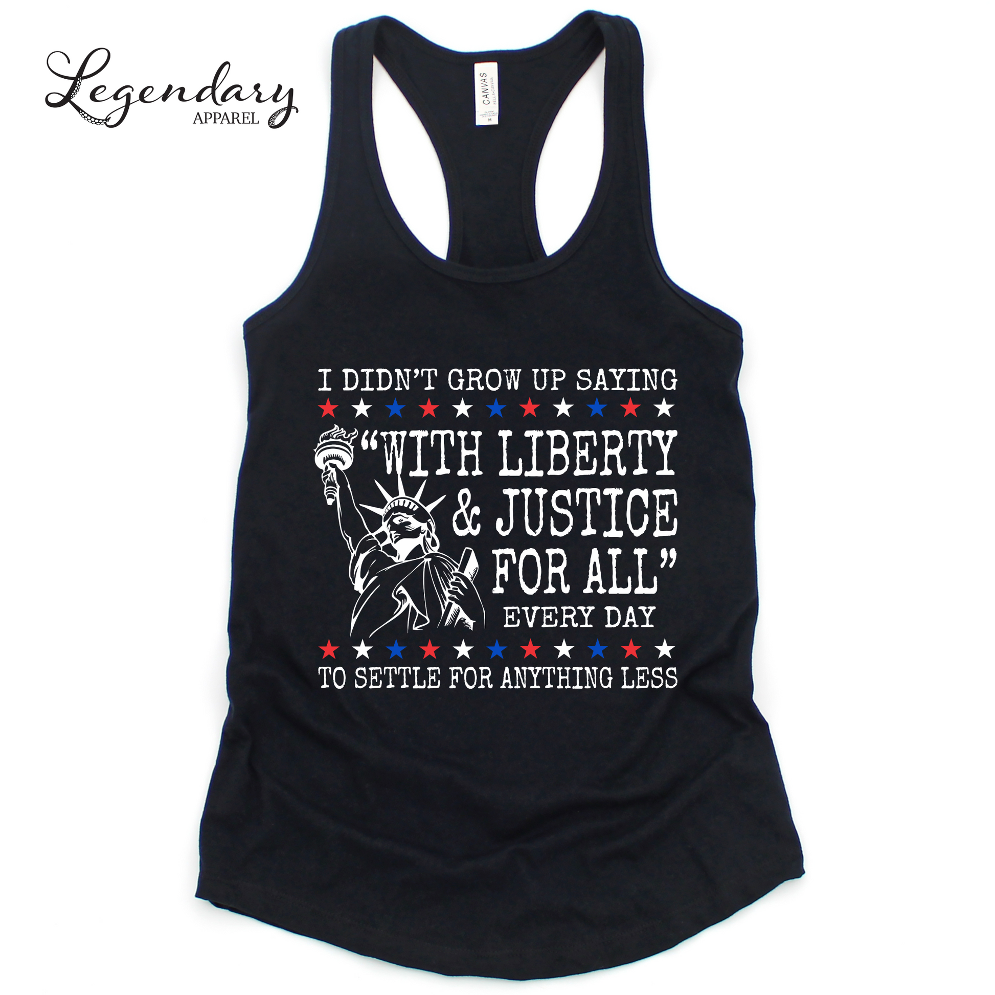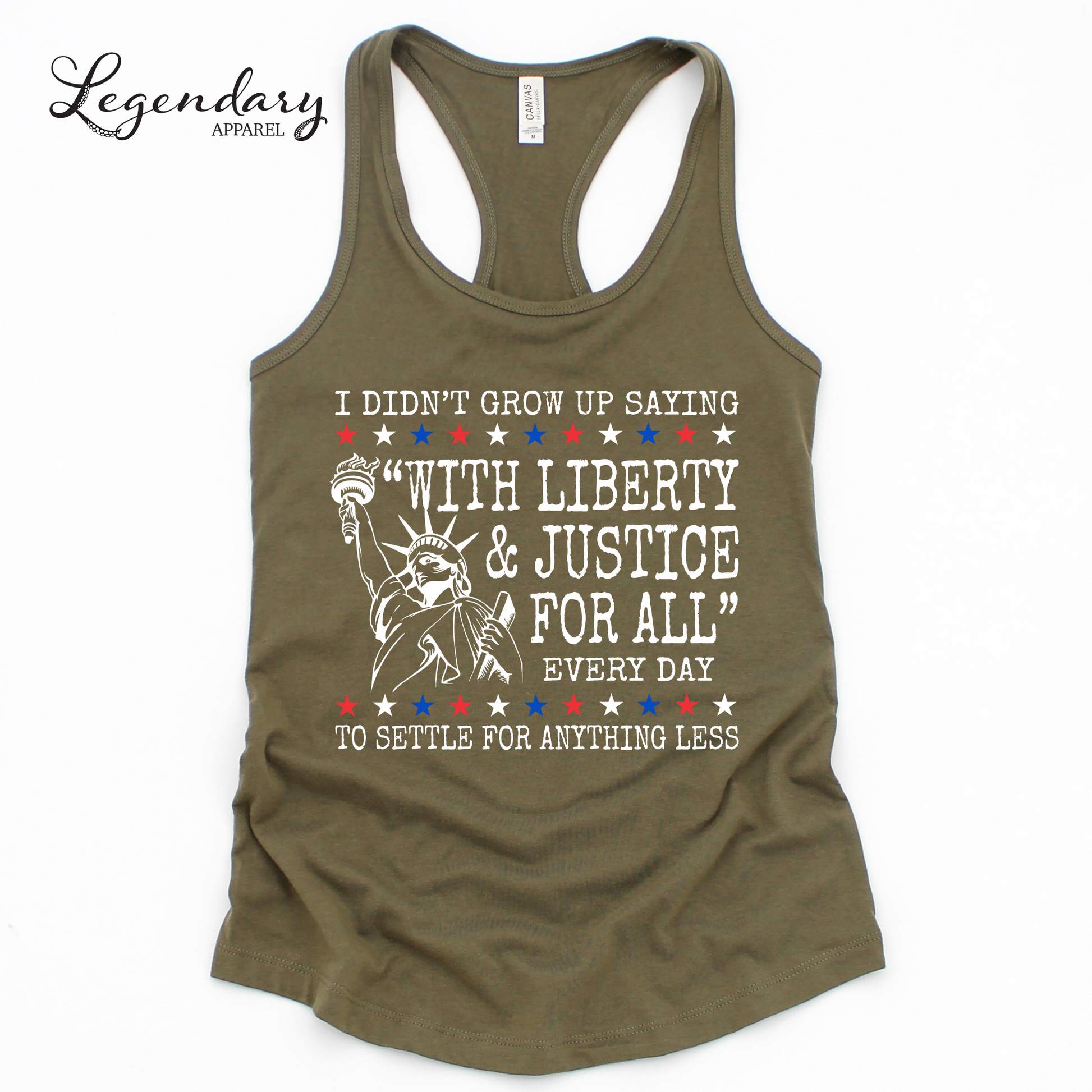 Stand proud with our "I Didn't Grow Up Saying With Liberty and Justice for All to Settle for Anything Else" tank top — a bold reminder that freedom and equality are not negotiable. This powerful and patriotic shirt is perfect for activists, proud Americans, and anyone who stands for justice and true liberty. Made with premium materials for comfort and durability, it's a statement piece for rallies, protests, Fourth of July celebrations, or everyday wear. Wear your values. Demand better. Never settle!
